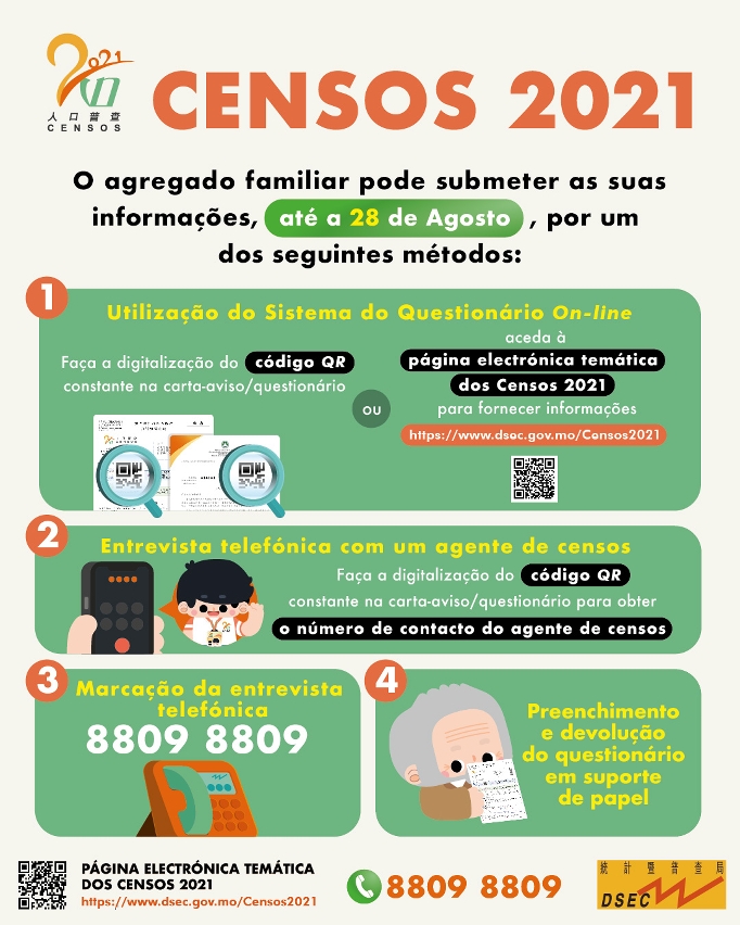 Os resultados dos Censos não só reflectem a evolução da estrutura demográfica de Macau e das respectivas características socioeconómicas, como também são referências relevantes para o Governo da RAEM no planeamento do futuro. A DSEC apela a todos os cidadãos de Macau que colaborem com a realização dos Censos e forneçam as informações correctas. Para mais pormenores sobre os Censos, queira aceder à página electrónica temática dos Censos 2021: https://www.dsec.gov.mo/Censos2021, ou ligar para a linha azul dos Censos 8809 8809.