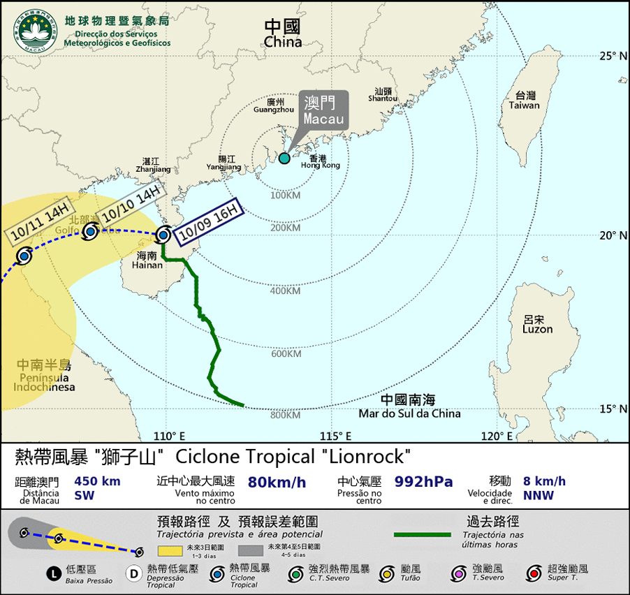 O sinal n.o 8 continua em vigor. Às 16:00 horas, o ciclone tropical “Lionrock” estava a cerca de 450 km a sudoeste de Macau e prevê-se que entre no Golfo “Beibu”. A área de chuva forte provocada pela confluência do "Lionrock" e da monção nordeste vai continuar a afectar o Estuário do Rio das Pérolas. Deste modo, o vento na região continua a soprar forte e ocasionalmente atinge o nível 7 - 8 da escala “Beaufort”. O sinal n.o 8 vai continuar em vigor por um período. Prevê-se que até o início da manhã de amanhã, o tempo na região continue a ser instável, havendo aguaceiros ocasionais acompanhados de trovoadas.