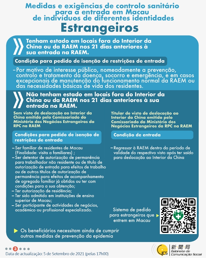 Medidas mais recentes de entrada e saída de Macau - actualização de 15 de Outubro