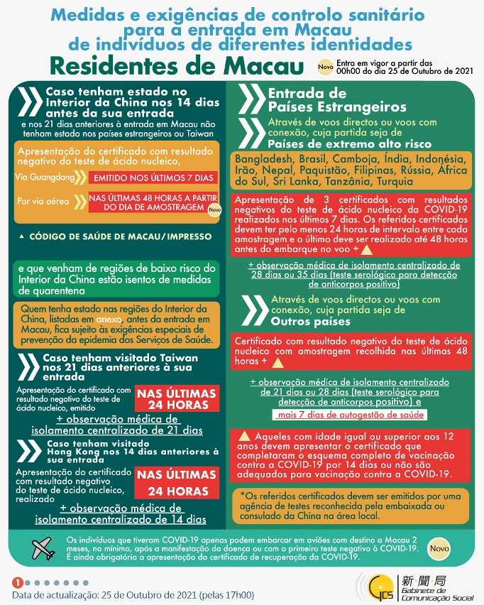 (Infografia)Medidas e exigências de controlo sanitário para a entrada em Macau de indivíduos de diferentes identidades, actualizadas no dia 4 de Novembro de 2021