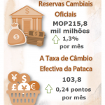 A taxa de câmbio efectiva da pataca, ponderada pelas suas quotas do comércio, foi de 103,8 em Novembro de 2021, registaram acrescimentos de 0,24 pontos e 0,15 pontos, respectivamente, sobre os dados do mês anterior e relativos a Novembro de 2020, implicando que globalmente, a pataca subiu face às moedas dos principais parceiros comerciais de Macau.