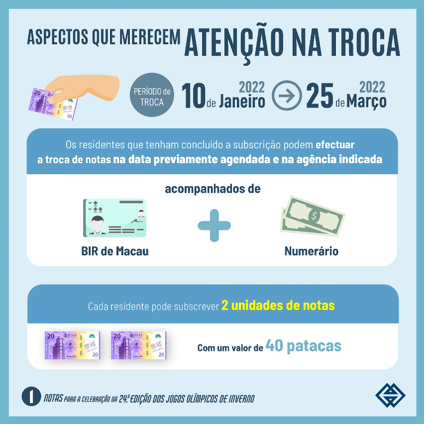 O prazo de troca das notas supramencionadas decorrerá entre 10 de Janeiro de 2022 (Segunda-feira) e 25 de Março de 2022 (Sexta-feira). Os residentes de Macau que efectuaram o registo para efeitos de troca devem fazer-se acompanhar do respectivo bilhete de identidade de residente de Macau e comparecer, na data previamente agendada, na agência indicada para a troca das notas, durante o horário expediente do banco, podendo também designar o seu representante para o levantamento das notas, o qual deve fazer-se acompanhar do original do seu bilhete de identidade de residente e comparecer, na data prevista e no local selecionado para a troca das notas, em nome do subscritor, devendo ainda ser portador dos seguintes documentos:
