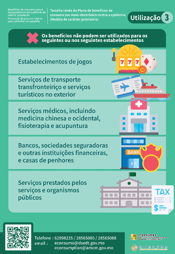 Os benefícios de consumo por meio electrónico apenas podem ser utilizados para aquisição de produtos ou serviços em Macau, mas não podendo ser utilizados em determinados estabelecimentos e determinadas finalidades legalmente previstas, como casinos, serviços turísticos no exterior, serviços de transporte transfronteiriço, serviços médicos e instituições financeiras.