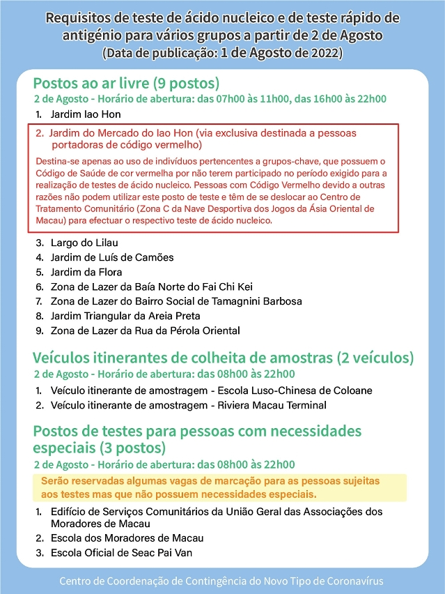 O Centro de Coordenação de Contingência do Novo Tipo de Coronavírus informa que, após a análise de risco, no dia 2 de Agosto (terça-feira), os grupos-chave e o grupo de trabalhadores, com necessidade de saírem de casa para o trabalho, têm de realizar os seguintes testes, a saber: