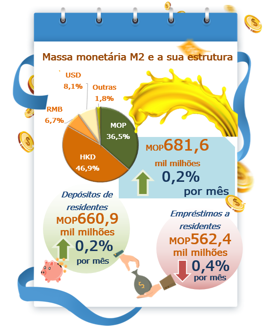 Os depósitos de residentes cresceram 0,2% em comparação com o mês anterior, tendo atingido MOP660,9 mil milhões. Os depósitos de não-residentes decresceram 11,8%, tendo atingido MOP327,2 mil milhões. Por enquanto, os depósitos do sector público na actividade bancária decresceram para MOP260,5 mil milhões, representando um decrescimento de 0,7%. Como resultado, o total dos depósitos da actividade bancária registou um decrescimento de 3,4% quando comparado com o mês anterior, tendo atingido MOP1.248,6 mil milhões. A proporção da MOP, dos HKD, dos RMB e dos USD nos depósitos foi de 20,1%, 48,2%, 7,8% e 21,5%, respectivamente.