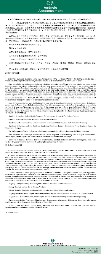 Tendo em consideração a evolução epidemiológica mais actualizada no Interior da China, os Serviços de Saúde, de acordo com o disposto nos artigos 10.º e 14.º da Lei n.º 2/2004 (Lei de Prevenção, Controlo e Tratamento de Doenças Transmissíveis), determinam que a partir da 01h00 do dia 31 de Outubro de 2022, são implementadas ou canceladas as medidas antiepidémicas para quem tenha estado em diversas áreas do Interior da China: