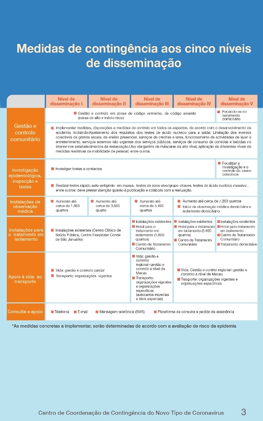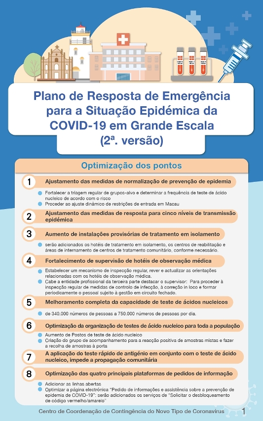 No “Plano de contingência, 2.ª versão”, no total foram revistos os 9 itens, incluindo: ajustar as medidas de prevenção e controlo de epidemia normalizada, ajustar as medidas de resposta de cinco níveis de transmissão, melhorar as instalações de isolamento centralizado, reforçar a supervisão de observação médica do hotel, melhorar completamente a capacidade de teste de ácido nucleico, melhorar o programa de teste do ácido nucleico para toda a população, evitar a propagação do vírus na comunidade, actualizar o quadro das medidas de controlo comunitário e optimizar as quatro plataformas de consulta.