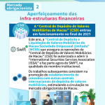 Este ano, a “Central de Depósito e Liquidação de Valores Mobiliários de Macau Sociedade Unipessoal Limitada” (MCSD) que assegura as operações da “Central de Depósito de Valores Mobiliários de Macau” (CSD), foi autorizada a aderir à “International Securities Services Association (ISSA)” e faz parte agora do SWIFT, na qualidade de membro institucional. Quanto aos seus trabalhos subsequentes, a MCSD promoverá o estabelecimento de conexões com outras centrais internacionais de depósito de valores mobiliários, estimulando a circulação no mercado obrigacionista de Macau.