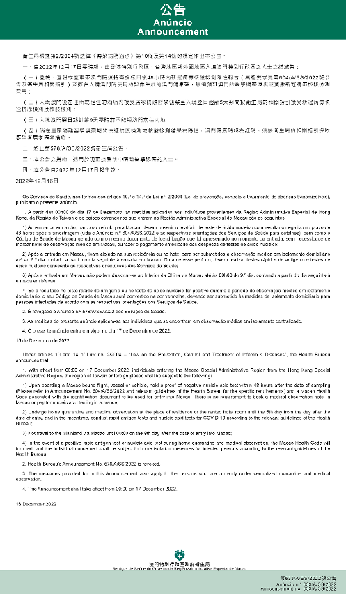 O Centro de Coordenação de Contingência do Novo Tipo de Coronavírus (adiante designado por Centro de Coordenação de Contingência) anunciou que, em resposta à epidemia e em articulação com as “Novas Dez Regras” do mecanismo conjunto de prevenção e controlo do Conselho de Estado, sob o pressuposto de manter a coerência com as medidas de prevenção e controlo “5+3” aplicadas no Interior da China aos indivíduos que entram no território, a partir das 00h00 do dia 17 de Dezembro de 2022, serão optimizadas as medidas de prevenção antiepidémica para os indivíduos provenientes de Hong Kong, Região de Taiwan e países estrangeiros que entram na Região Administrativa Especial de Macau, de cinco (5) dias de observação médica em isolamento centralizado mais três (3) dias em isolamento domiciliário passa para cinco (5) dias de observação médica em isolamento domiciliário mais três (3) dias de interdição de saída de Macau (adiante designadas por medidas de “Optimização 5+3”).