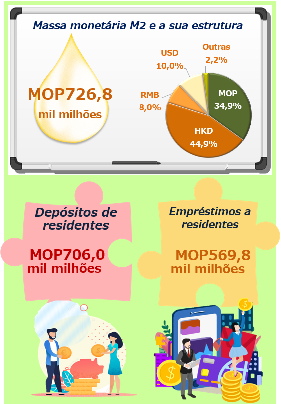 Quando comparado com o mês anterior, a circulação monetária decresceu 1,2%, mas os depósitos à ordem cresceram 4,6%. M1, assim, cresceu 2,9%, relativamente ao mês anterior. Por enquanto, as responsabilidades quase monetárias cresceram 1,3%. A soma destes dois elementos, ou seja, M2, voltou a crescer 1,5% relativamente ao mês anterior, tendo atingido MOP726,8 mil milhões. Quando comparado com o período homólogo de 2022, M1 manteve-se inalterado e M2 cresceu 5,9%. A proporção da pataca (MOP), dos dólares de Hong Kong (HKD), dos renminbi (RMB) e dos dólares dos Estados Unidos (USD) registou os “pesos” de 34,9%, 44,9%, 8,0% e 10,0%, respectivamente, em M2.