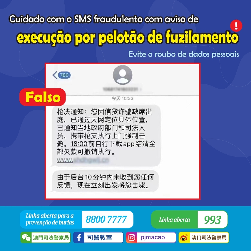 A Polícia Judiciária (PJ) descobriu recentemente mensagens de texto SMS com links de fonte desconhecida que os criminosos têm vindo a enviar dizendo ao destinatário que este não se apresentou no tribunal para julgamento de um caso de fraude. Assim, por essa ausência, pedem-lhe para clicar no link indicado nessa mensagem e fazer o download de um programa de fonte desconhecida. Para fazer com que vítima instale o tal programa, diz ainda a mensagem que, se essa pessoa não fizer o que lhe é pedido, é-lhe aplicada a pena de morte por pelotão de fuzilamento.