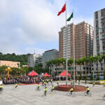 Chefe do Executivo, Ho Iat Seng, oficiais do Governo Central em Macau, oficiais da Guarnição do ELP em Macau, responsáveis dos órgãos legislativo e judicial da RAEM, titulares dos principais cargos do Governo da RAEM, e individualidades da sociedade civil participam na cerimónia do içar das bandeiras, no âmbito das comemorações do 74.º aniversário da implantação da República Popular da China, na Praça Flor de Lótus Dourado.