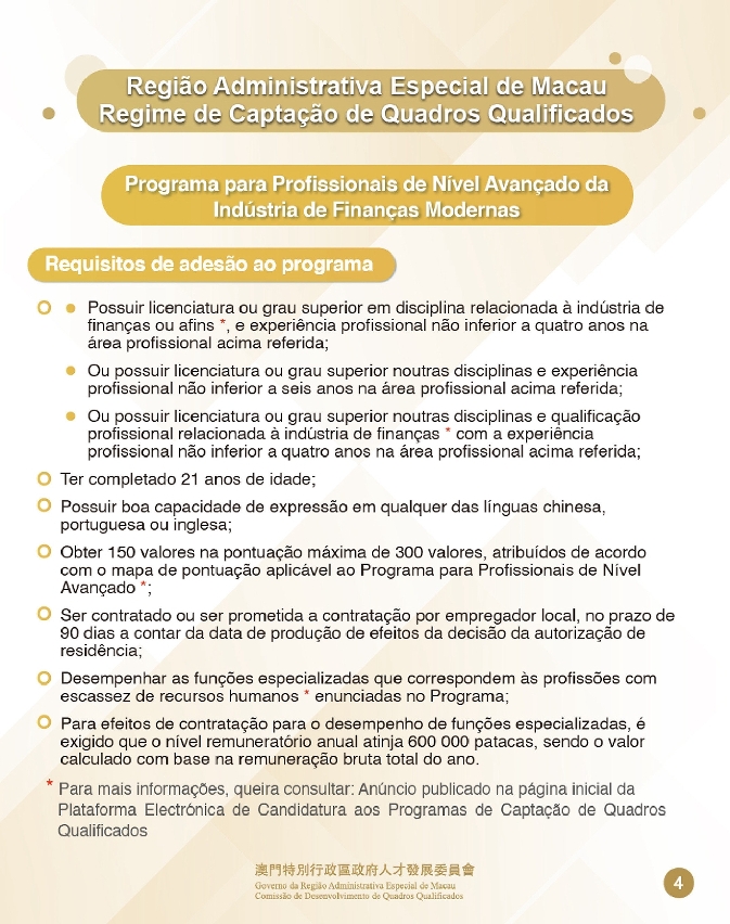 De 6 de Outubro de 2023 a 5 de Fevereiro de 2024, encontra-se aberto o período de candidaturas ao Programa para Profissionais de Nível Avançado da Indústria de Finanças Modernas, que visa captar indivíduos com experiência profissional e competência técnica que contribuam para o desenvolvimento da indústria de finanças modernas, nas seguintes áreas profissionais: 1) Desenvolvimento de actividades do mercado de títulos de dívida; 2) Desenvolvimento de actividades de gestão de fortunas; 3) Desenvolvimento de actividades de finanças sustentáveis; 4) Desenvolvimento de actividades de bancos comerciais; 5) Desenvolvimento de actividades seguradoras; 6) Desenvolvimento de aplicações de tecnologia financeira; 7) Investigação financeira. Os candidatos têm de preencher, cumulativamente, os seguintes requisitos: possuir licenciatura ou grau superior em disciplina relacionada à indústria de finanças ou afins, e experiência profissional não inferior a quatro anos na área profissional acima referida; ou possuir licenciatura ou grau superior noutras disciplinas e experiência profissional não inferior a seis anos na área profissional acima referida; ou possuir licenciatura ou grau superior noutras disciplinas e qualificação profissional relacionada à indústria de finanças com a experiência profissional não inferior a quatro anos na área profissional acima referida; ter completado 21 anos de idade; possuir boa capacidade de expressão em qualquer das línguas chinesa, portuguesa ou inglesa; obter 150 valores na pontuação máxima de 300 valores, atribuídos de acordo com o mapa de pontuação aplicável ao programa; ser contratado ou ser prometida a contratação por empregador local, no prazo de 90 dias a contar da data de produção de efeitos da decisão da autorização de residência, para o desempenho de funções especializadas que correspondem às profissões com escassez de recursos humanos enunciadas no programa, sendo exigido que, para o efeito, o nível remuneratório anual atinja 600 000 patacas, sendo o valor calculado com base na remuneração bruta total do ano, independentemente da sua designação, modo de pagamento ou forma de cálculo.