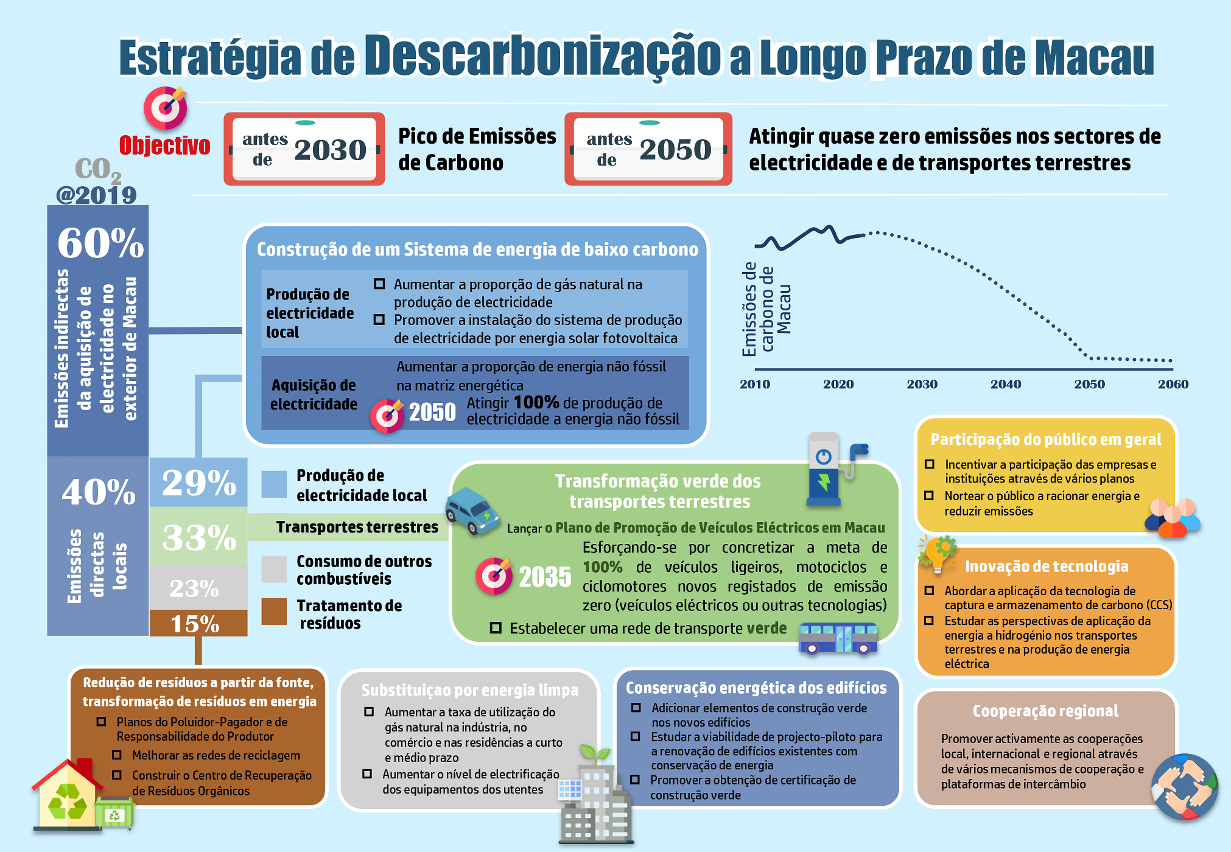 Posto isto, o Governo da RAEM concluiu a elaboração da Estratégia de Descarbonização a Longo Prazo de Macau com base nos respectivos estudos e na análise global das tendências e experiências a nível internacional e do andamento dos trabalhos de descarbonização de Macau, tendo em consideração as opiniões dos serviços competentes e associações. Propõe-se “implementar activamente medidas de descarbonização em diferentes áreas e fases” como a direcção geral do desenvolvimento de descarbonização a longo prazo de Macau, bem como “atingir o pico de emissões de carbono antes de 2030 e promover as áreas de eletricidade e transportes terrestres para alcançar uma descarbonização profunda antes de 2050 e atingir emissões quase zero” como objectivo geral.
