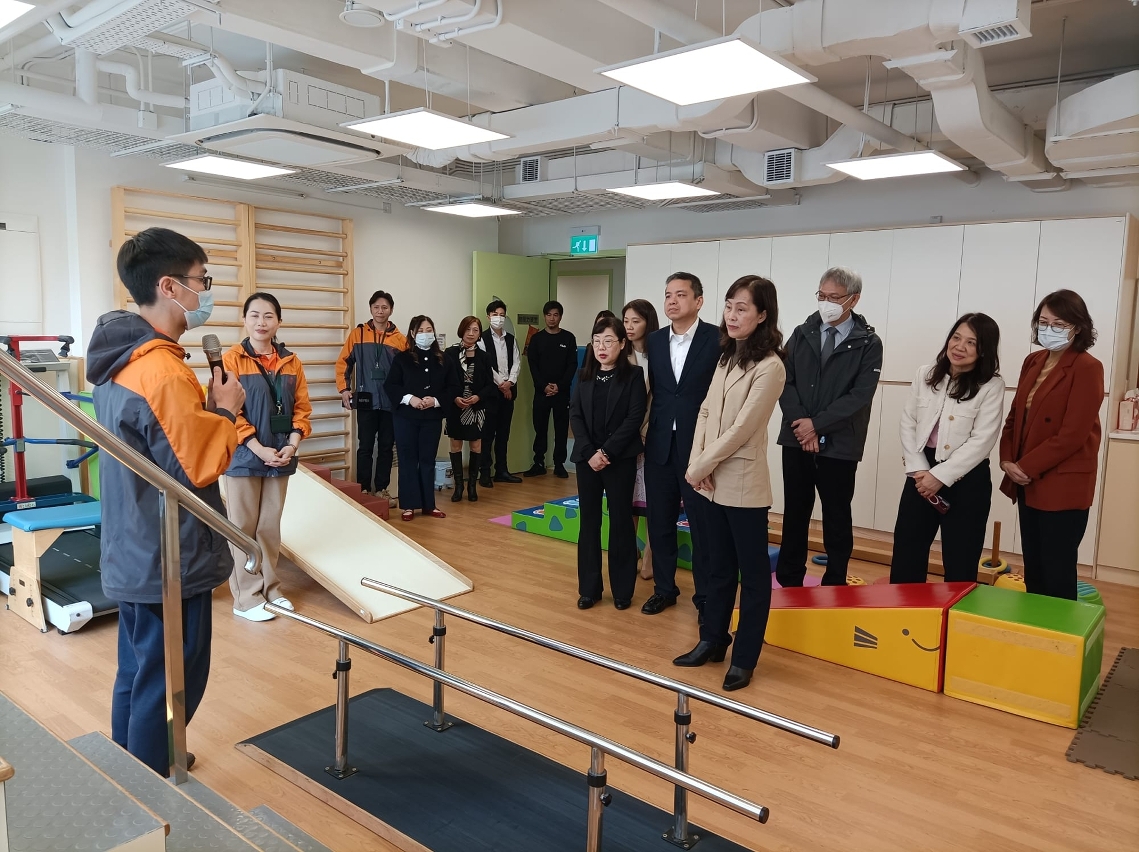 Seguidamente, a Secretária Ao Ieong U deslocou-se ao Centro de Formação Inicial – Kai Chi, onde visitou as instalações de acolhimento temporário, a sala de actividades para o tratamento precoce, a sala de terapia ocupacional, a sala de fisioterapia, a sala de terapia da fala, a casa de banho das crianças de tenra idade, o auditório, etc. Durante a visita, o trabalhador apresentou que as instalações ambientais do Centro e os serviços são prestados de acordo com as necessidades de desenvolvimento e crescimento das crianças de tenra idade, por exemplo, o Centro está equipado de diversos tipos de casas de banho para as respectivas crianças. Ademais, referiu que quanto ao serviço de intervenção precoce, são proporcionados treinos e tratamentos diversificados de acordo com as diferentes necessidades das crianças com necessidades especiais, tais como, treino muscular, treino de equilíbrio, terapia da fala, entre outros, em prol da exploração das suas potencialidades e da integração à vida comunitária. Quanto à sala de actividades para acolhimento temporário, esta é utilizada para a prestação de serviços de acolhimento após as aulas, nos sábados, nas férias de Verão, bem como para a prestação do serviço de acolhimento urgente, às crianças com dificuldades de desenvolvimento e com necessidade de educação especial. A Secretária Ao Ieong U agradeceu especialmente ao Centro por ter proporcionado às crianças, tratamentos e treinos adequados que ajudem as mesmas a aumentarem as suas capacidades individuais e a terem um crescimento saudável e feliz.