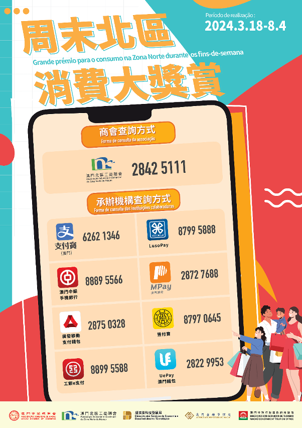 O Governo da RAEM, juntamente com a Associação Comercial de Macau e a Associação Industrial e Comercial da Zona Norte de Macau, coorganiza, entre 18 de Março e 4 de Agosto, a actividade “Grande prémio para o consumo na Zona Norte durante os fins-de-semana”. As entidades organizadoras esperam que o Governo, as associações comerciais e os comerciantes comunitários empenhem-se conjuntamente em dar continuidade à eficácia do “Carnaval de Consumo na Zona Norte”, encorajando, continuadamente residentes a consumirem na zona comunitária através da oferta de benefícios electrónicos para consumo na Zona Norte aos fins-de-semana após o consumo efectuado de segunda a sexta-feira, de modo a promover o ciclo do consumo na zona e, por conseguinte, aumentar a confiança das PME na exploração dos negócios.