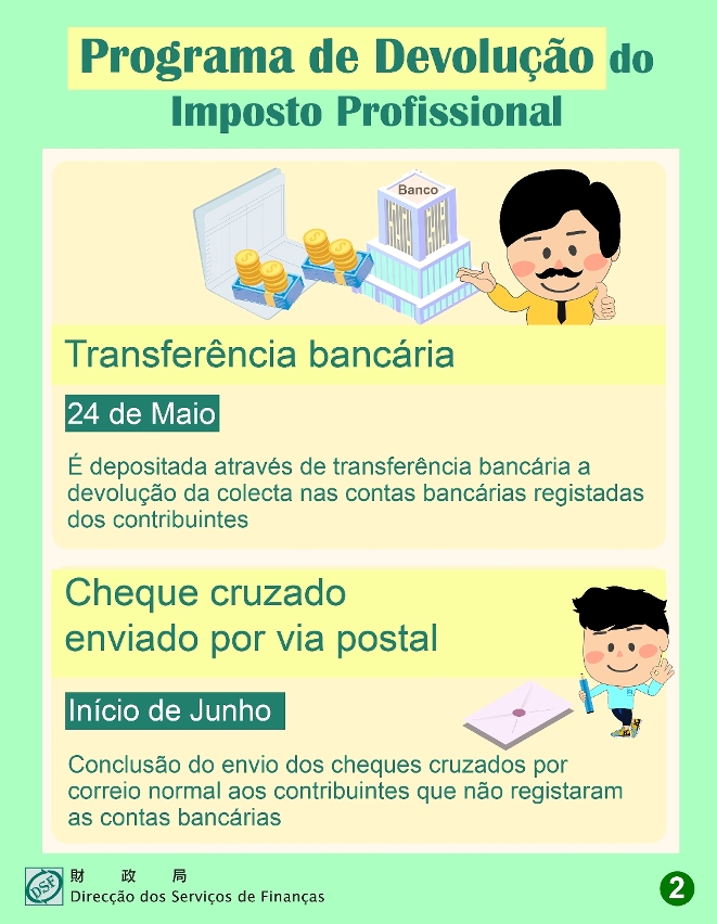 A Direcção dos Serviços de Finanças vai atribuir a devolução da colecta através de transferência bancária ou de cheque cruzado enviado por via postal. No dia 24 de Maio é depositada a devolução da colecta nas contas bancárias dos contribuintes registados para a transferência bancária, enquanto para aqueles não registados são enviados sucessivamente, os cheques cruzados conforme os endereços de correspondência fiscal registados em sede de imposto profissional nestes Serviços, esperando-se a conclusão dos trabalhos de envio dos cheques cruzados no início de Junho.