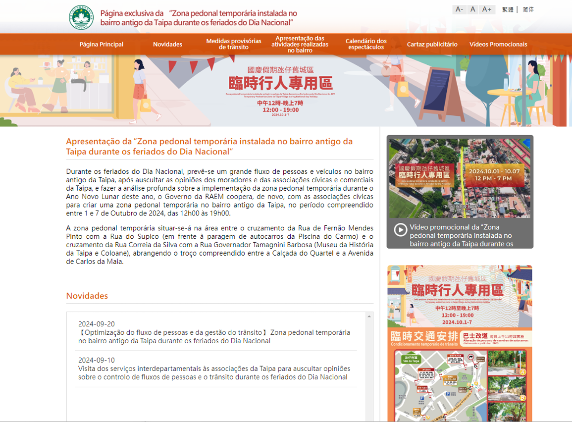 Os trabalhos de promoção online e presenciais da DST estão em curso, tendo sido produzido um vídeo promocional para apresentar as medidas provisórias da zona pedonal e condicionamentos de trânsito relacionados. O vídeo promocional está a ser divulgado em várias plataformas, incluindo: nos balcões de Informações Turísticas da DST; ecrãs de autocarros locais; nas contas oficiais nas redes sociais em Hong Kong, no Interior da China e no exterior, para que os visitantes de Macau possam conhecer antecipadamente as disposições.