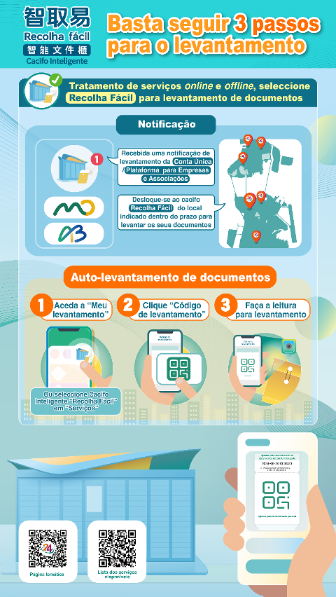 Os cacifos inteligentes da “Recolha fácil” encontram-se localizados, actualmente, em seis Centros de Serviços de Auto-Atendimento de 24 horas do Governo, nomeadamente da Praia Grande, Areia Preta, Fai Chi Kei, Centro da Taipa, Lago e Seac Pai Van. Para o levantamento de documentos, os cidadãos apenas necessitam de aceder ao código de levantamento na Conta Única de Macau ou na Plataforma para Empresas e Associações e efectuar a leitura do código para confirmar o levantamento.