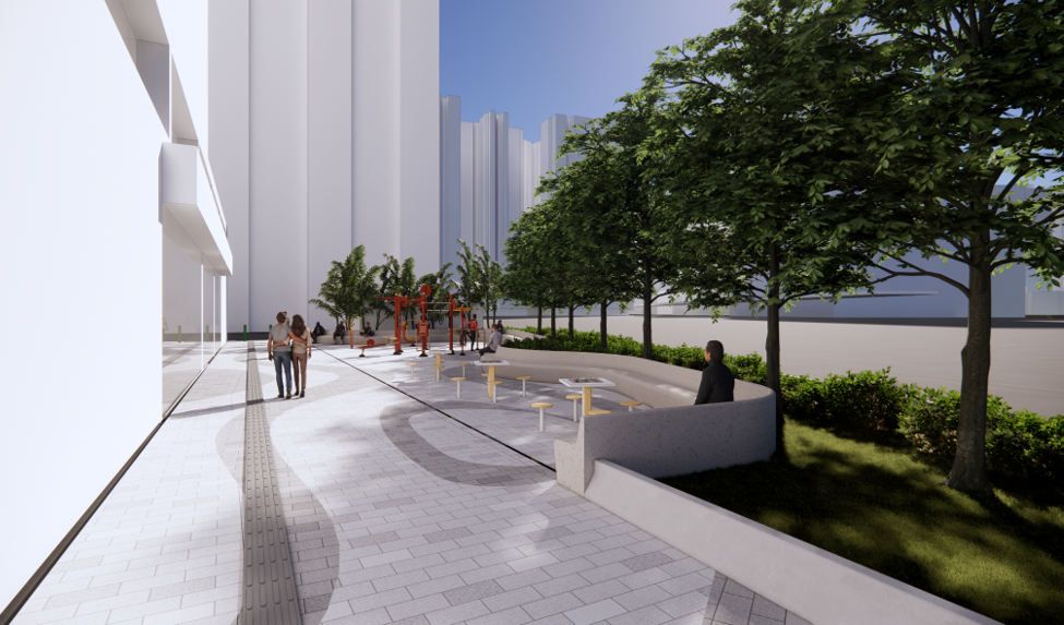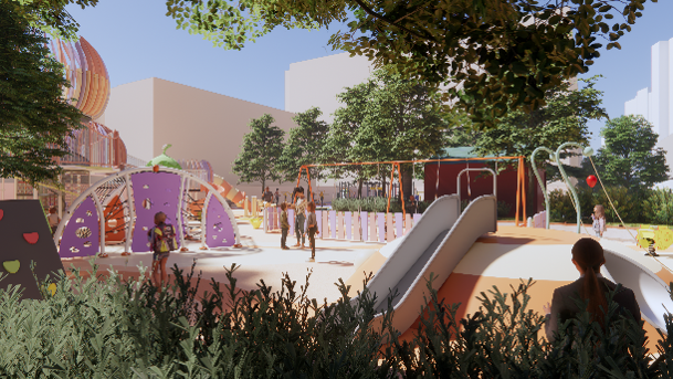 A Zona de lazer da Rua Central de Tói Sán ocupa uma área de cerca de 870 metros quadrados. Dado que se localiza perto de várias escolas, a taxa de utilização por pais e crianças é alta. O design integra elementos naturais, preservando as árvores existentes. Em harmonia com a paisagem arborizada, é oferecida aos utentes diversão num oásis urbano. Sob a envolvência de árvores, irão ser adicionados equipamentos personalizados para crianças em formato de casa na árvore, instalados trilhos aéreos de aventuras, com vista a aproveitar plenamente o limitado espaço para proporcionar aos jovens e crianças um local para brincar e explorar a natureza. Ao mesmo tempo, será levado a cabo um novo planeamento da disposição, criando zonas desportivas e recreativas, optimizando a linha de circulação pedonal da zona e elevando a qualidade ambiental da zona de lazer.