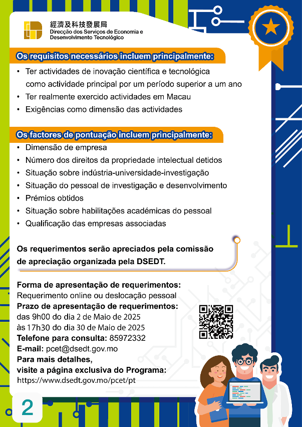 O prazo de candidatura desta ronda decorrerá entre 2 e 30 de Maio de 2025, podendo os interessados apresentar as suas candidaturas através do sistema online da DSEDT. O Governo da RAEM tem prestado sucessivamente apoio às empresas certificadas em vários aspectos, tais como capital, quadros qualificados e emparelhamento. Para conhecer os pormenores da candidatura e as respectivas medidas de apoio, podem consultar a página exclusiva do Programa ( https://www.dsedt.gov.mo/pcet/pt/index.jsp ) ou ligar para o telefone n.º 8597 2332.