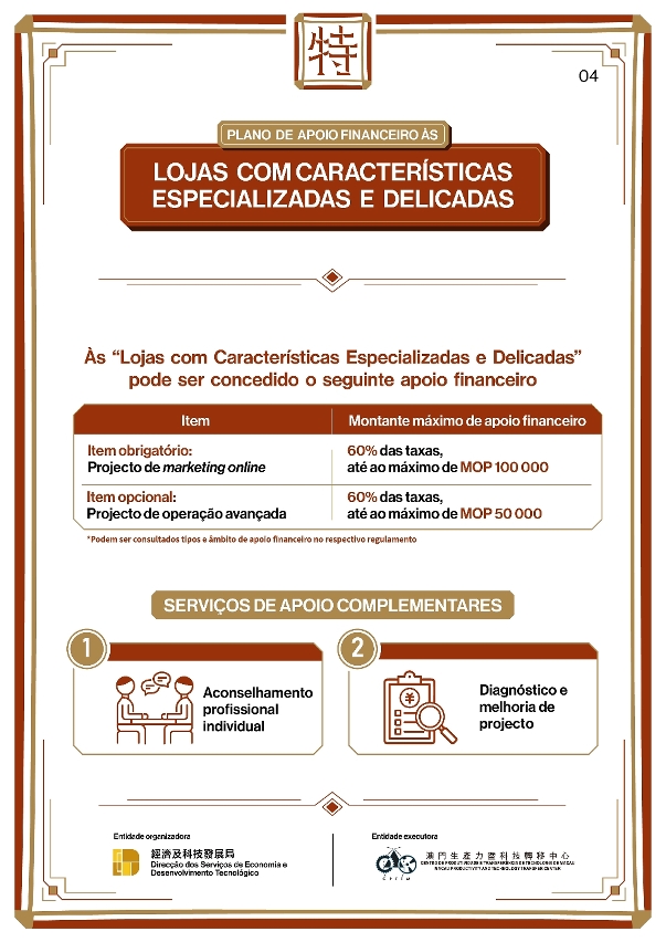 As PME classificadas como “Lojas com Características Especializadas e Delicadas” podem receber um financiamento no valor de 60% das taxas designadas relacionadas com a implementação de marketing online, criação de montras distintas e lançamento de produtos de colaboração com IP, sujeito a um limite máximo de 150.000 de patacas. Além disso, a entidade executora fornecerá aconselhamento profissional individual às “Lojas com Características Especializadas e Delicadas”, e realizará diagnóstico e melhoramento do plano de negócio e projecto de exploração.