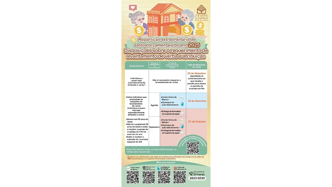 Os idosos que efectuaram a inscrição de levantamento automático e que preencham os requisitos de atribuição, bem como os três tipos de indivíduos (incluindo os idosos com idade igual ou superior a 65 anos a quem não seja efectuada a atribuição automática, os idosos que não tenham completado 65 anos de idade, mas que estejam a receber a pensão de invalidez há mais de um ano, e os indivíduos que estejam a receber o subsídio de invalidez especial) que efectuaram, em Agosto, o requerimento de levantamento de verba através da “Conta Única de Macau” ou dos quiosques de auto-atendimento, a verba da subconta de gestão do Governo autorizada será depositada em 25 de Setembro na conta bancária indicada. Quanto aos indivíduos que efectuaram o requerimento de levantamento de verba em suporte de papel em Agosto ou que apresentaram requerimentos em Setembro, a verba será depositada, o mais cedo em 27 de Outubro, na conta bancária indicada.