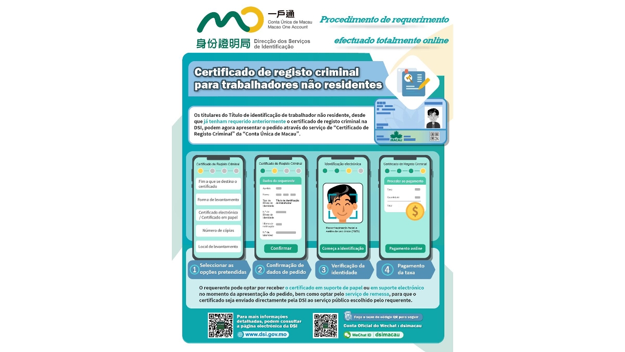 Para continuar a melhorar os serviços relacionados com a vida da população e responder activamente às necessidades dos cidadãos no tratamento de documentos online, a Direcção dos Serviços de Identificação (DSI) disponibiliza, a partir de hoje (dia 30), na “Conta Única de Macau”, o serviço de requerimento do certificado de registo criminal para trabalhadores não residentes (TNRs), concretizando assim um tratamento caracterizado por “procedimento de requerimento e de levantamento integralmente online”, para que os TNRs possam tratar do certificado de registo criminal sem necessidade de deslocação pessoal, atingindo o resultado de maior conveniência para os cidadão e simplificação administrativa.
