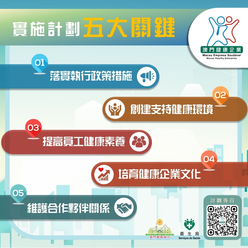 O programa “Empresas Saudáveis” foca-se em cinco áreas principais: 1) Implementar as políticas de saúde e comprometer-se publicamente com a criação de um ambiente de trabalho que apoie a saúde dos trabalhadores; 2) Criar um ambiente favorável à saúde, incluindo a promoção de uma alimentação saudável, a prática regular de exercício físico, a realização de exames físicos aos trabalhadores, a disponibilização de equipamentos de saúde e a divulgação regular de informações de saúde; 3) Melhorar a literacia em saúde dos trabalhadores, ajudá-los a desenvolverem um estilo de vida saudável através da educação e formação; 4) Cultivar uma cultura empresarial saudável, valorizar as necessidades de saúde dos trabalhadores, promover o equilíbrio entre o trabalho e a vida pessoal e criar uma atmosfera de cuidado e apoio mútuos; 5) Reforçar as relações de parceria, promover a cooperação entre as empresas, o Governo e os diversos sectores da sociedade, no sentido de elevar, em conjunto, o nível geral de saúde da sociedade.