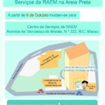 Os serviços da Direcção dos Serviços de Finanças, do Centro de Serviços da RAEM - Atendimento Fiscal e Recebedoria, sito na Rua Nova da Areia Preta, N.º 52, em Macau, têm como último dia de funcionamento, o dia 3 de Outubro de 2025, e passam a funcionar a partir de 6 de Outubro de 2025, no Centro de Serviços da RAEM, instalado na Avenida de Venceslau de Morais, N.º 222, R/C, em Macau, onde continua a prestação de serviços ao público.