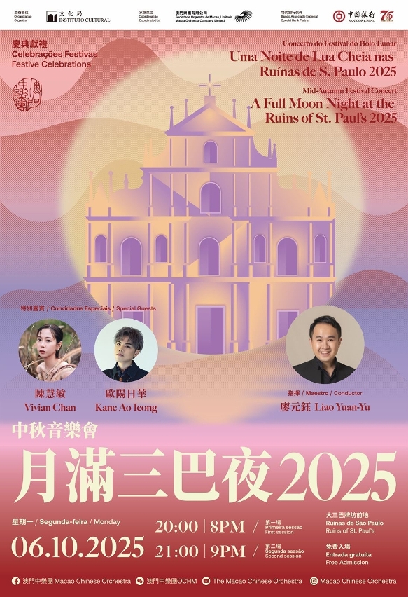 Organizado pelo Instituto Cultural e coordenado pela Sociedade Orquestra de Macau, Limitada, o concerto, dedicado ao Festival do Meio Outono, “Uma Noite de Lua Cheia nas Ruínas de S. Paulo 2025”, terá lugar no dia 6 de Outubro, com duas sessões às 20h00 e às 21h00, nas Ruínas de São Paulo. A Orquestra Chinesa de Macau (OCHM) interpretará diversas melodias festivas, colaborando especialmente com os cantores Vivian Chan e Kane Ao Ieong. O espectáculo fundirá os sons tradicionais chineses com a beleza do património mundial, para celebrar esta ocasião especial com os residentes e visitantes.