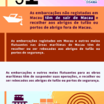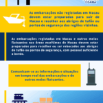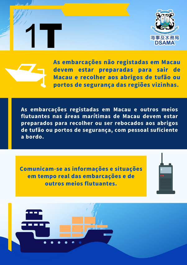 Com a aproximação do ciclone tropical, o tempo em Macau poderá piorar gradualmente, especialmente quando estiver içado o n.º 3, com um grande número de embarcações a entrar no fundeadouro do Porto Interior para se abrigar do tufão, devem o sector em causa tomar precauções o mais rápido possível. Com o sinal n.º 3 de tempestade tropical içado, as embarcações de obras devem abandonar o local de operação e as embarcações de pesca devem regressar a Macau o mais cedo possível para se abrigarem do tufão, reservando tempo suficiente para o regresso, a fim de garantir a segurança das embarcações e a fixação dos cabos, prevenir com rigor as ameaças à segurança ou as perdas de mercadorias provocadas pelo mau tempo e pelo storm surge. Caso seja necessário, a DSAMA poderá notificar as pessoas de contacto das pontes-cais no Porto Interior para proceder à colocação de painéis de retenção de água, em conformidade com o Plano de contingência provisório para controlo de inundações no Porto Interior.