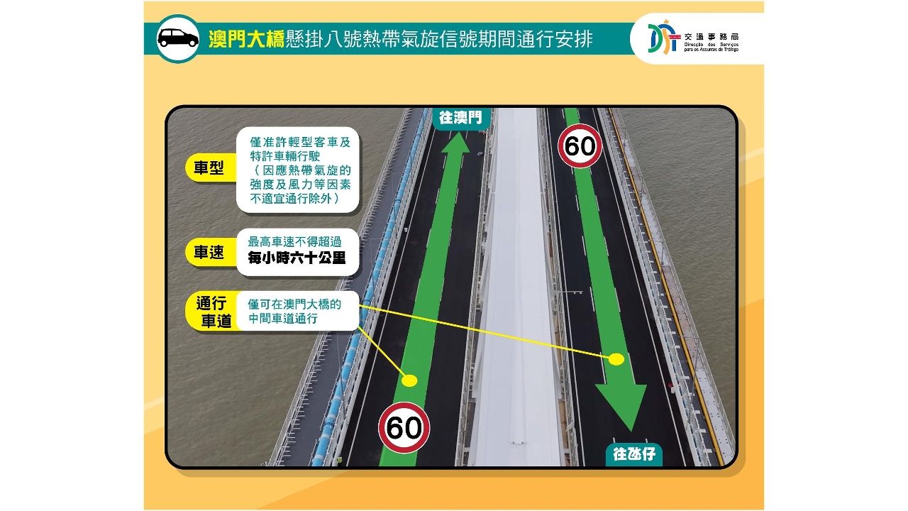 A fim de garantir as necessidades de deslocação dos cidadãos entre a Península de Macau e a Taipa em situações meteorológicas adversas, após coordenação interdepartamental, o Governo da RAEM irá abrir a Ponte Macau para trânsito condicionado durante a vigência do sinal n.º 8 de tempestade tropical (consulte a tabela para mais detalhes). No entanto, o Comandante de Acção Conjunta de Protecção Civil poderá proibir, a qualquer momento, a circulação de automóveis ligeiros de passageiros na Ponte Macau, caso factores como a intensidade das tempestades tropicais, o nível da água no «Storm Surge», a precipitação e a força do vento constituam riscos capazes de prejudicar a segurança pública. Solicita-se a atenção dos cidadãos.