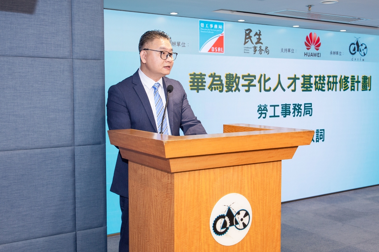 A cerimónia de abertura do curso do “Plano de formação básica de quadros qualificados da Huawei na área digital”, coorganizado pela Direcção dos Serviços para os Assuntos Laborais (DSAL) do Governo da Região Administrativa Especial de Macau (RAEM) e pela Direcção dos Serviços de Assuntos de Subsistência da Zona de Cooperação Aprofundada entre Guangdong e Macau em Hengqin (DSAS), com o apoio da Sociedade de Serviços Huawei (Hong Kong) Lda. - Sucursal de Macau e a colaboração do Centro de Produtividade e Transferência de Tecnologia de Macau (CPTTM), realizou-se hoje de manhã (dia 9) com sucesso no auditório sito na sede do CPTTM.
