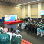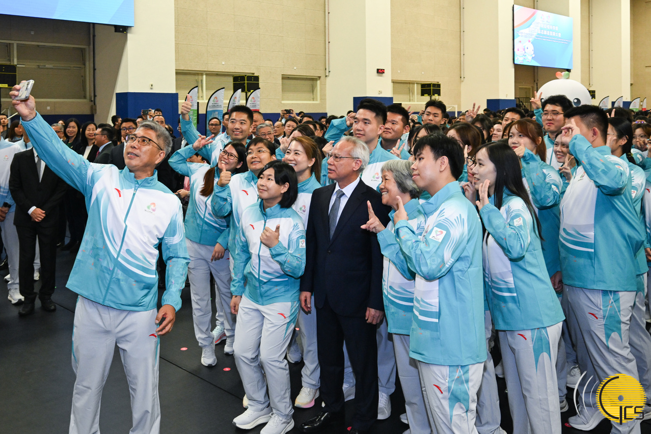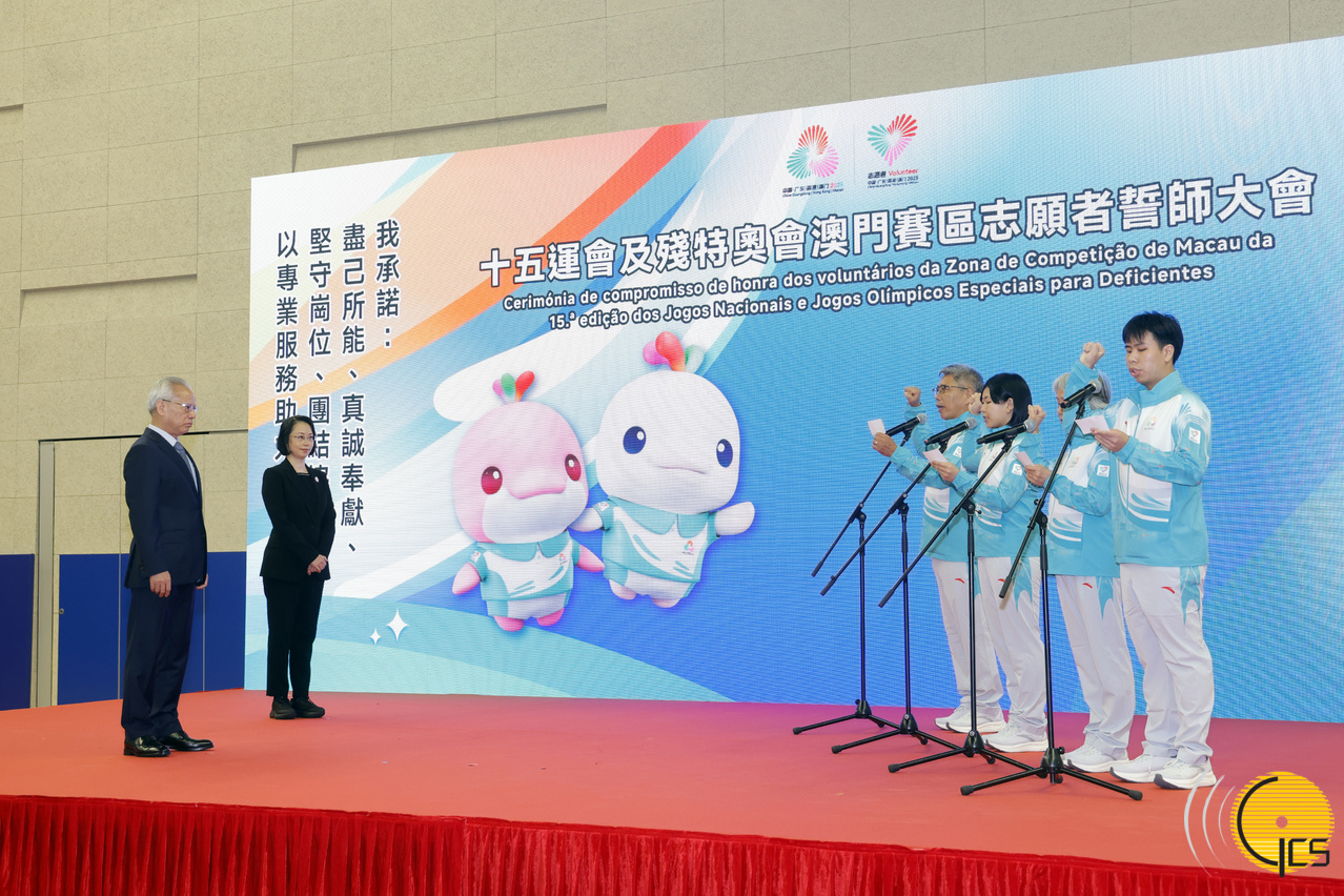 Chefe do Executivo, Sam Hou Fai, nas cerimónias de entrega da bandeira da RAEM à delegação desportiva de Macau e de compromisso dos Voluntários da Zona de Competição de Macau da 15.ª edição dos Jogos Nacionais e Jogos Olímpicos Especiais para Deficientes.