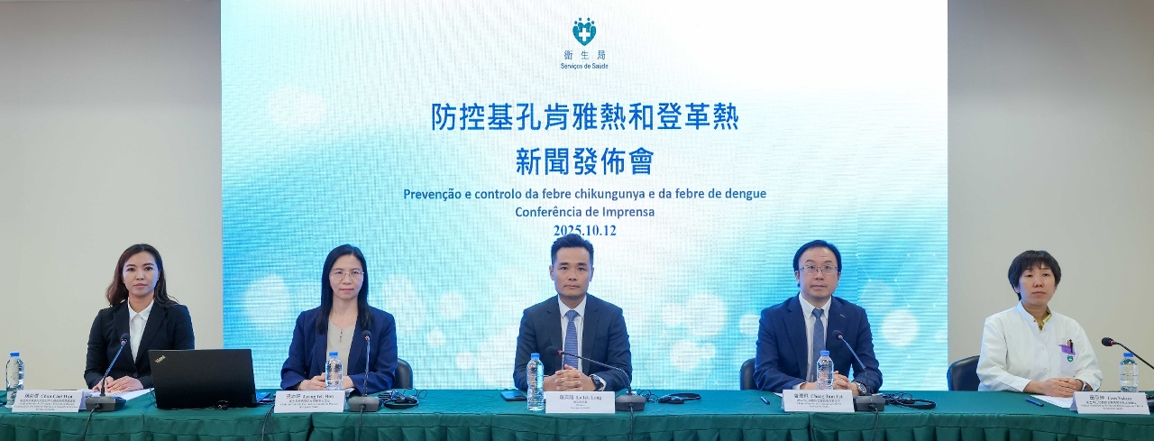 Com o objectivo de permitir aos residentes conhecerem, o mais cedo possível, as estratégias gerais de prevenção e controlo e as medidas concretas de implementação do Governo da RAEM em resposta à febre de dengue e à febre Chikungunya (doravante designada por duas febres), os Serviços de Saúde realizaram este domingo (dia 12 de Outubro) uma conferência de imprensa para apresentar a situação epidemiológica e as medidas de prevenção e controlo das febres, na expectativa de que os residentes se mantenham atentos e possam colaborar activamente com o Governo da RAEM nos trabalhos de prevenção e eliminação de mosquitos e de detecção precoce de casos. A conferência de imprensa contou com a presença do Director dos Serviços de Saúde, Dr. Lo Iek Long, Chefe do Centro de Prevenção e Controlo de Doenças dos Serviços de Saúde, Leong Iek Hou, Médico-Adjunto do Centro Hospitalar Conde de São Januário, Chang Tam Fei, Chefe da Divisão de Prevenção e Controlo das Doenças Trasmissíveis, Chan Choi Wan, e da médica assistente do Serviço de Infecciologia do Centro Hospitalar Conde de São Januário, Tian Yakun.