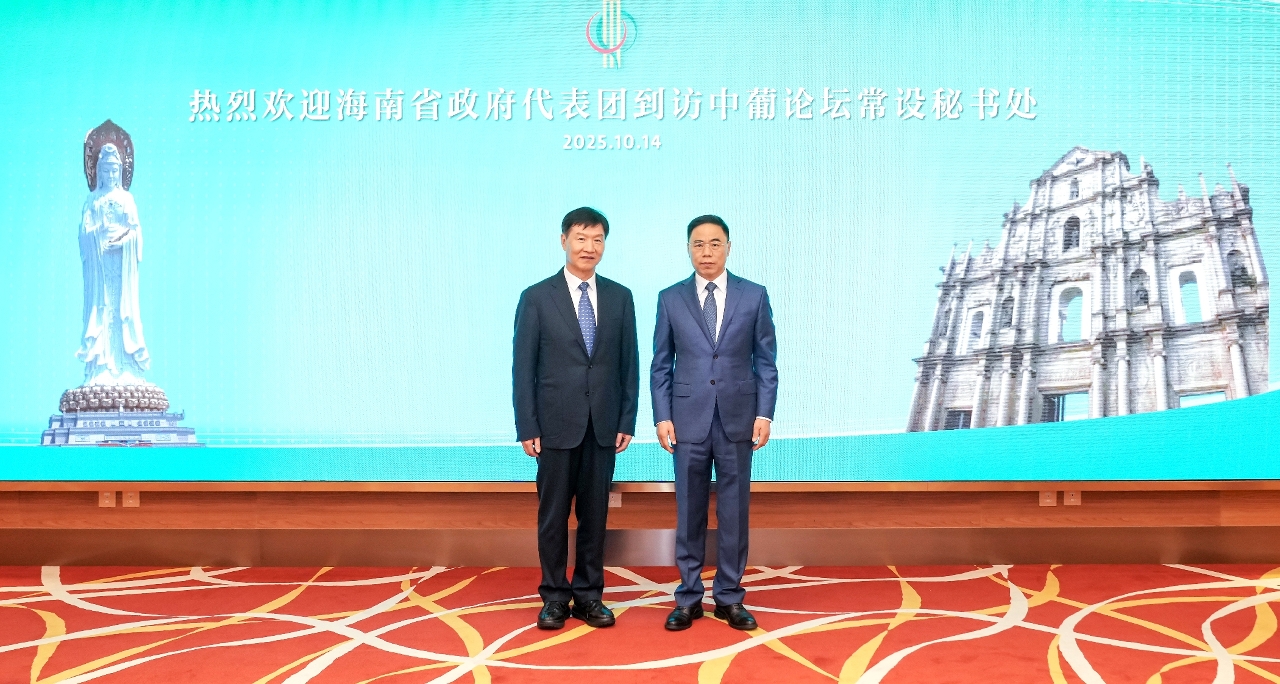 No dia 14 de Outubro, a delegação da Província de Hainan liderada pelo Governador do Governo Popular Provincial de Hainan, Liu Xiaoming, efectuou uma visita ao Secretariado Permanente do Fórum para a Cooperação Económica e Comercial entre a China e os Países de Língua Portuguesa (Macau), e encontrou-se com o Secretário-Geral do Secretariado Permanente do Fórum de Macau, Ji Xianzheng. As duas partes trocaram impressões sobre a potenciação plena do mecanismo multilateral do Fórum de Macau e das vantagens da Plataforma de Macau, e a intensificação do intercâmbio no contexto da cooperação económica e comercial entre a Província de Hainan e os Países de Língua Portuguesa.