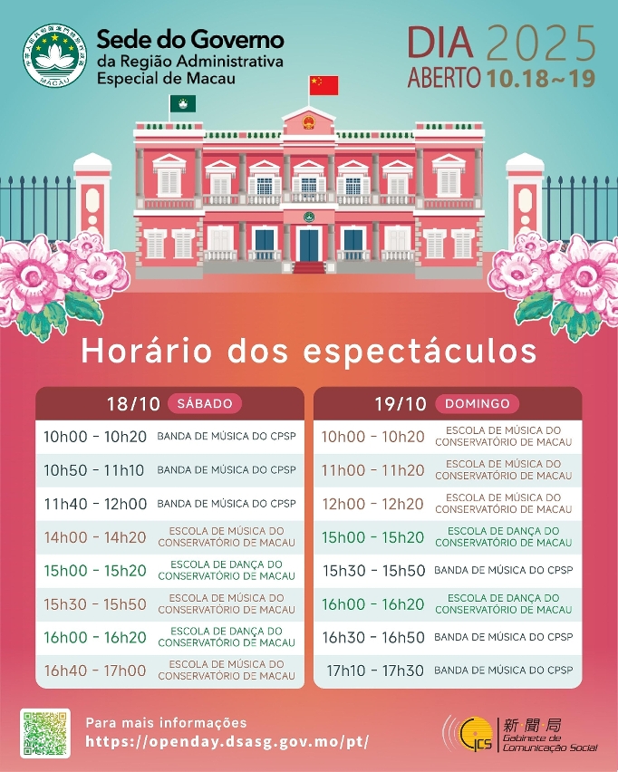 A população pode ainda assistir a uma série de espectáculos, nomeadamente, da Banda da PSP e dos alunos da Escola de Música e Escola de Dança do Conservatório de Macau. A Direcção dos Serviços de Correios e Telecomunicações também terá disponível um posto temporário, no lado oposto à Sede do Governo, no lago Nam Van, onde se poderá pôr o carimbo comemorativo, comprar os produtos filatélicos, no âmbito do dia da abertura da Sede do Governo.