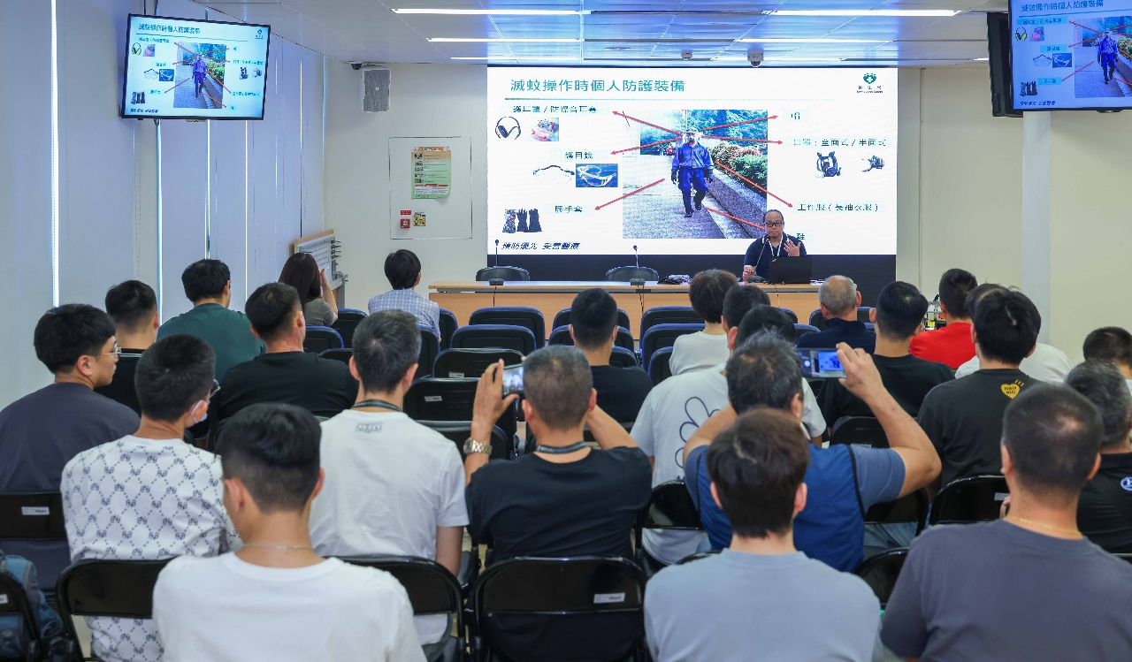 Esta de formação foi dividida em duas partes: uma parte teórica realizada no interior da sala e outra de operação prática no exterior. O conteúdo abrange 1) explicação sobre o equipamento de proteção individual que o pessoal operacional deve utilizar, para garantir a segurança pessoal durante o uso de produtos químicos e máquinas; 2) apresentação sobre os tipos e características de equipamentos de eliminação de mosquitos, assim como os produtos químicos, para conhecer as funções dos diferentes equipamentos, os cenários aplicáveis e a melhor ocasião de pulverização; 3) descrição sistemática sobre os procedimentos operacionais e as observações de eliminação de mosquitos, para dominar os métodos de operação padrão; 4) demonstração in loco, por pessoal profissional, da operação de pulverizadores de volume ultrabaixo e termonebulizadores, bem como organização de exercícios práticos em grupos, para familiarizar-se com a operação dos equipamentos e as técnicas de pulverização, visando melhorar a capacidade cabal de operação prática.