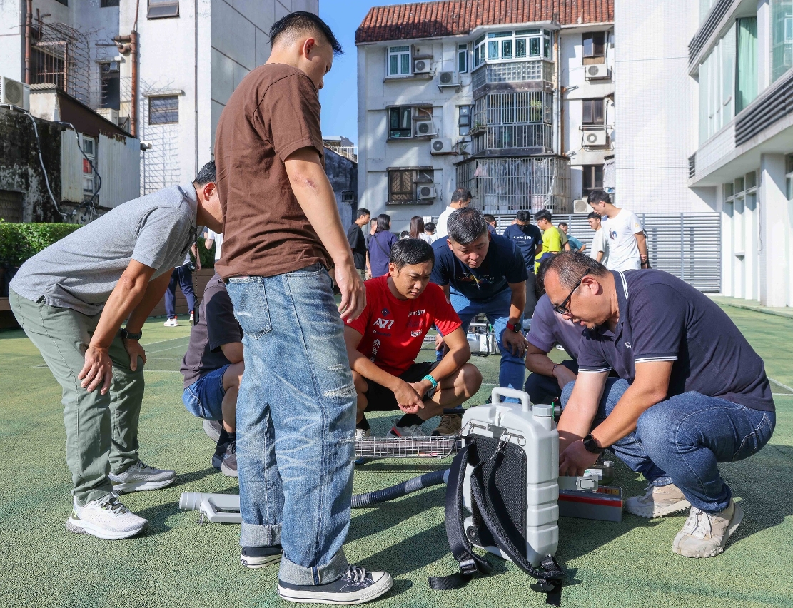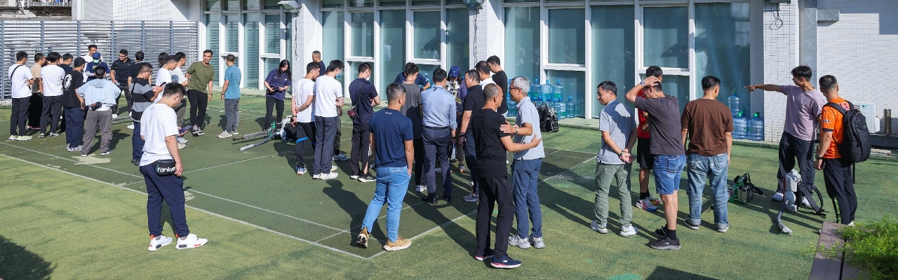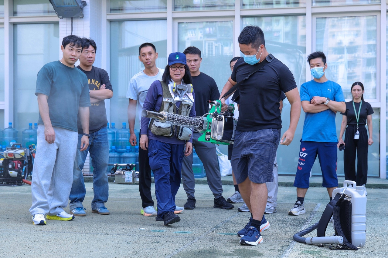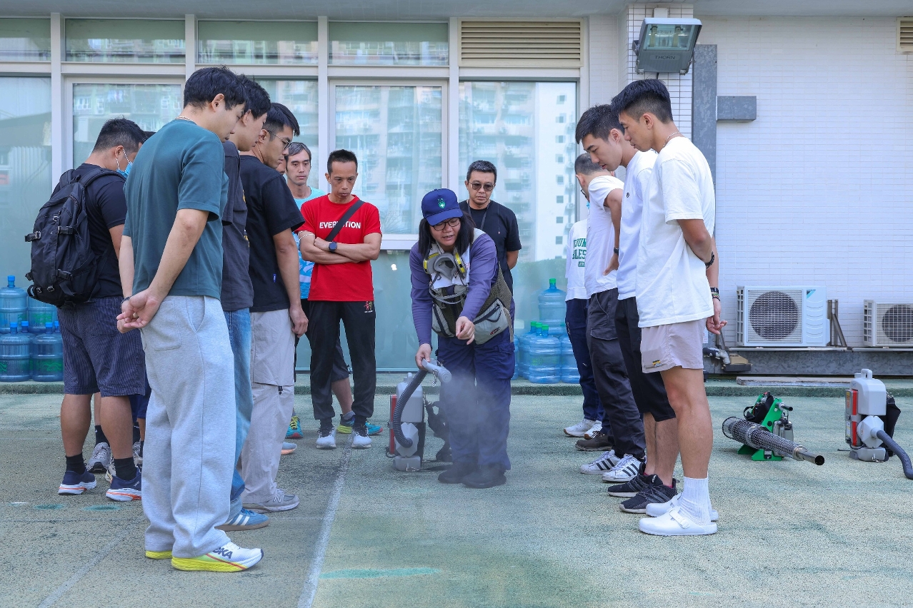 Esta de formação foi dividida em duas partes: uma parte teórica realizada no interior da sala e outra de operação prática no exterior. O conteúdo abrange 1) explicação sobre o equipamento de proteção individual que o pessoal operacional deve utilizar, para garantir a segurança pessoal durante o uso de produtos químicos e máquinas; 2) apresentação sobre os tipos e características de equipamentos de eliminação de mosquitos, assim como os produtos químicos, para conhecer as funções dos diferentes equipamentos, os cenários aplicáveis e a melhor ocasião de pulverização; 3) descrição sistemática sobre os procedimentos operacionais e as observações de eliminação de mosquitos, para dominar os métodos de operação padrão; 4) demonstração in loco, por pessoal profissional, da operação de pulverizadores de volume ultrabaixo e termonebulizadores, bem como organização de exercícios práticos em grupos, para familiarizar-se com a operação dos equipamentos e as técnicas de pulverização, visando melhorar a capacidade cabal de operação prática.