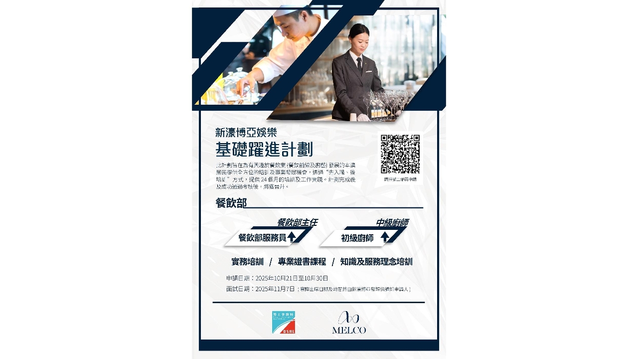 Com o objectivo de proporcionar uma formação abrangente e as oportunidades de desenvolvimento de carreira aos residentes de Macau que estejam interessados em seguir uma carreira no sector da hotelaria e restauração, a Direcção dos Serviços para os Assuntos Laborais (DSAL) e a Melco Resorts & Entertainment lançam, em conjunto, o “Plano de progresso básico da Melco Resorts & Entertainment - Restauração”, proporcionando, em regime de “primeiro contratação, depois formação” oportunidades de desenvolvimento de carreira a esses residentes. Aceitam-se as candidaturas ao Plano a partir do dia 21 de Outubro.