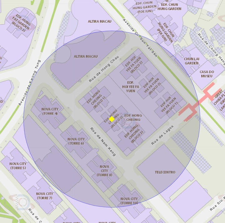 A área de risco com um raio de 100 metros, delimita o Edifício Hong Cheong (Bloco 2) da Taipa