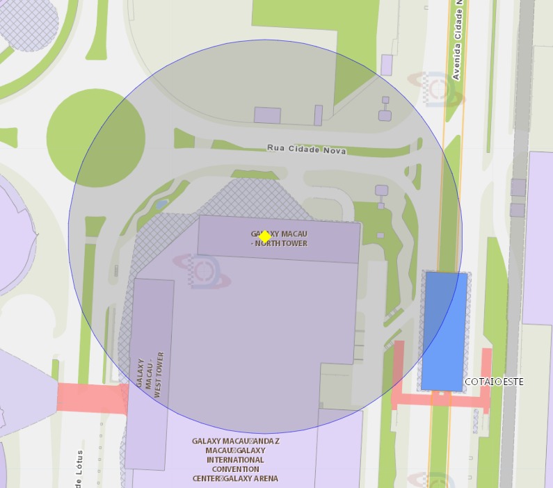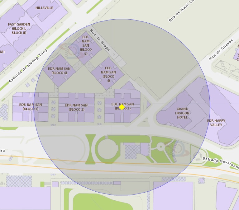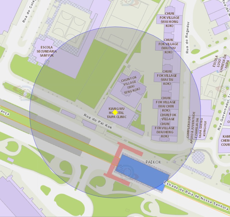A área de risco com um raio de 100 metros, delimita o Edifício Hong Cheong (Bloco 2) da Taipa
