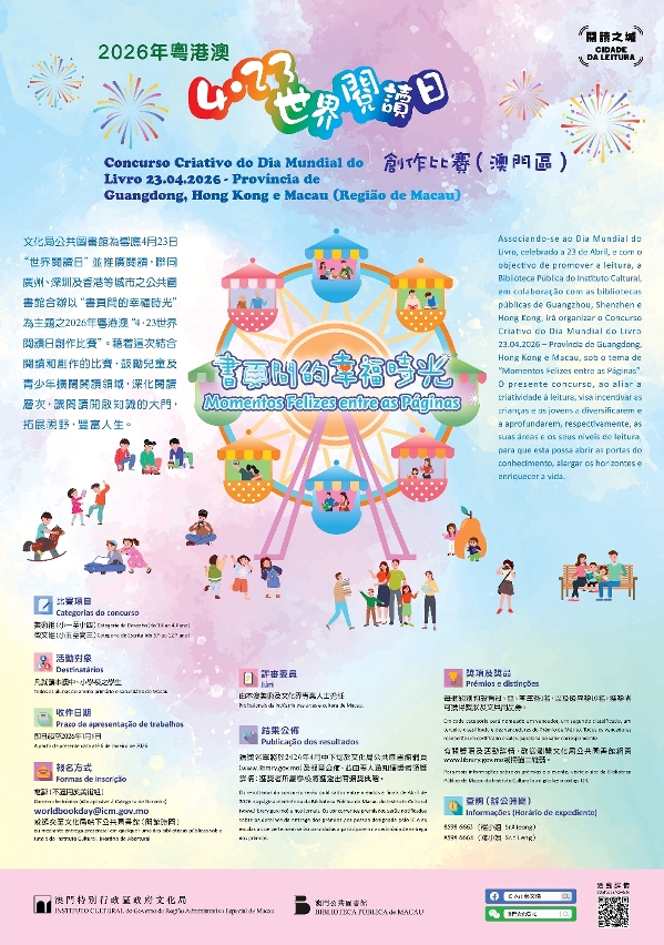 No âmbito do “Dia Mundial do Livro, que se celebra anualmente no dia 23 de Abril, a Biblioteca Pública do Instituto Cultural (IC) organiza, em colaboração com as bibliotecas públicas de Guangzhou, Shenzhen e Hong Kong, o “Concurso Criativo do Dia Mundial do Livro 23.04.2026 – Província de Guangdong, Hong Kong e Macau”, subordinado ao tema “Momentos Felizes entre as Páginas”. Aliando criatividade à leitura, este concurso visa incentivar crianças e jovens a diversificar as suas áreas de leitura e a aprofundar os seus conhecimentos, para que os livros possam abrir as portas do saber, alargar horizontes e enriquecer as suas vidas. O prazo de apresentação de trabalhos na região de Macau decorre desde a presente data até 6 de Janeiro de 2026.