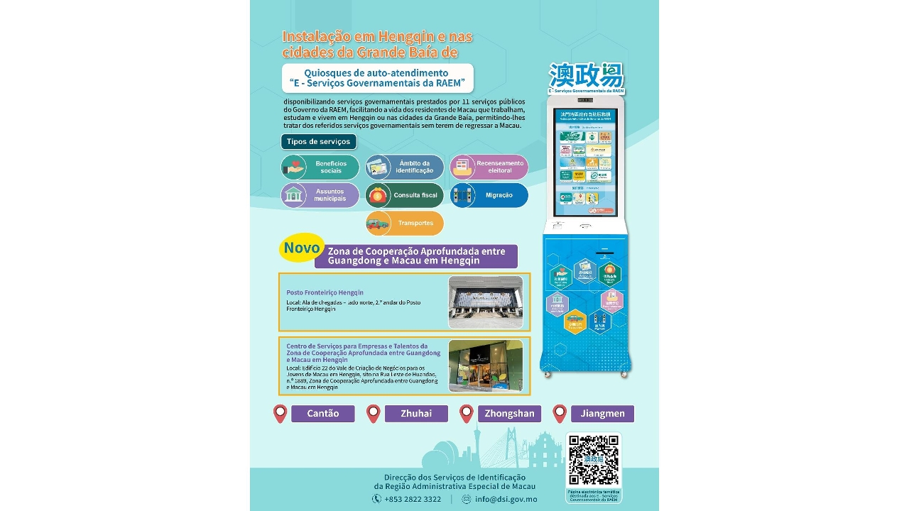 Os quiosques de auto-atendimento “E - Serviços Governamentais da RAEM” disponibilizam um total de 37 serviços governamentais que são mais procurados pelos residentes de Macau, prestados por 11 entidades públicas, em sete categorias, nomeadamente nas áreas de benefícios sociais, identificação, consulta fiscal, assuntos municipais, recenseamento eleitoral, transportes e migração, a fim de facilitar a vida dos residentes de Macau que trabalham e vivem na Zona de Cooperação Aprofundada, permitindo-lhes tratar dos serviços necessários sem terem de regressar a Macau, contribuindo assim para a criação de um ambiente habitável semelhante entre Macau e Hengqin. Os “E - Serviços Governamentais da RAEM” serão instalados no lado norte do átrio de chegadas do segundo andar do Posto Fronteiriço Hengqin, bem como no Centro de Serviços para Empresas e Quadros Qualificados da Zona de Cooperação Aprofundada entre Guangdong e Macau em Hengqin (endereço: Edifício n.º 22 do Vale de Criação de Negócios para os Jovens de Macau em Hengqin, sito na Rua Huan Dao Tong Lu, n.º 1889, Zona de Cooperação Aprofundada entre Guangdong e Macau em Hengqin). Além disso, em Junho do corrente ano, os referidos quiosques de auto-atendimento já se encontram instalados em quatro cidades da Grande Baía: Cantão, Zhuhai, Zhongshan e Jiangmen. Para mais informações sobre os quiosques de auto-atendimento “E - Serviços Governamentais da RAEM”, consulte a página electrónica temática: https://www.dsi.gov.mo/mo-eservice/.
