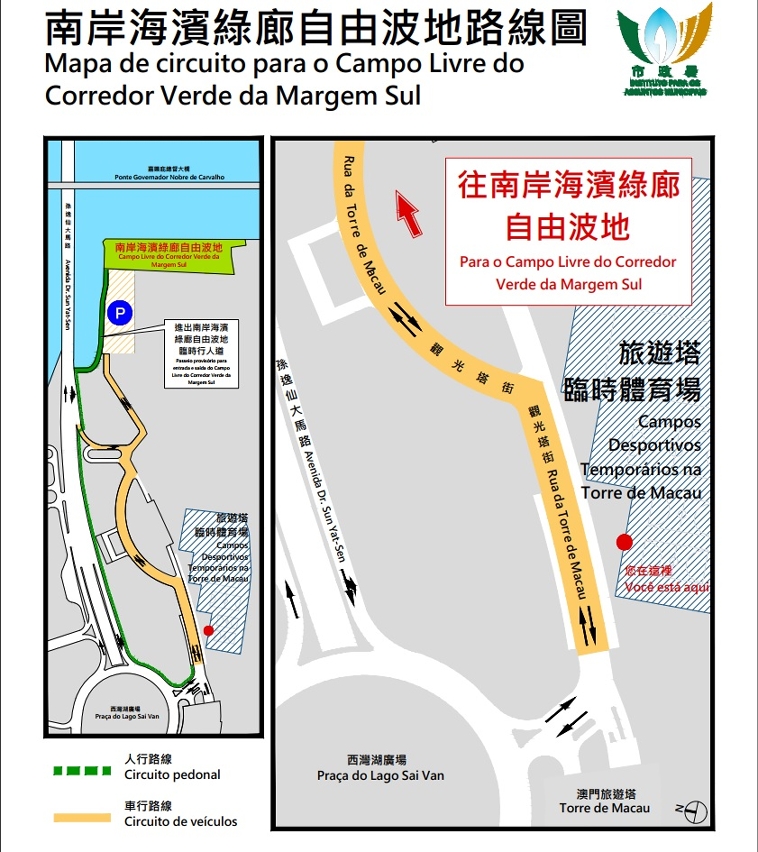 O Instituto para os Assuntos Municipais (IAM) está a avançar de forma faseada e ordenada com a obra da segunda fase do Corredor Verde da Margem Sul, dividida em três zonas. A Zona 1, cuja função principal é a de ter campos desportivos, abriu ao público às 7:00 horas de hoje (dia 17 de Novembro). Os cidadãos podem aceder à Zona 1 utilizando o parque de estacionamento temporário localizado na mesma ou através do passeio pedonal temporário com acesso pela Avenida Dr. Sun Yat-Sen.