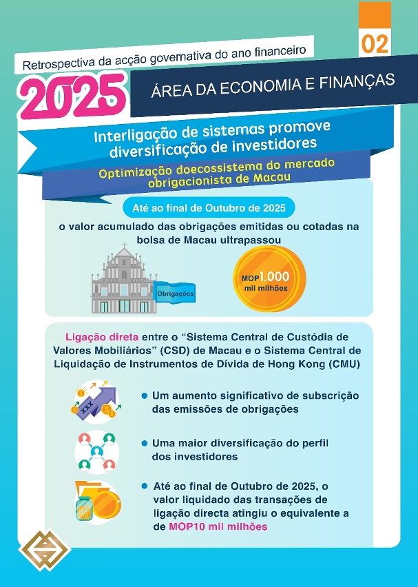 O lançamento do serviço de rede e interligação directa entre a Central de Depósito de Valores Mobiliários de Macau e a “Central Moneymarkets Unit” de Hong Kong, em Janeiro deste ano, representa a interligação e interconexão das infraestruturas dos mercados obrigacionistas de Macau e de Hong Kong, criando as condições favoráveis para atrair investidores internacionais diversificados para o mercado obrigacionista de Macau. Além disso, foram sucessivamente emitidas, em Macau, obrigações de alta qualidade, nomeadamente, obrigações soberanas, obrigações do Governo local da Província de Guangdong e obrigações do Governo local da Cidade Shenzhen. Entre estas, a Província de Guangdong emitiu títulos de dívida do Governo local, no valor de RMB 2,5 mil milhões, que incluiu obrigações verdes, obrigações azuis e obrigações temáticas dedicadas ao projecto da 15.ª edição dos Jogos Nacionais. Por sua vez, o Governo local de Shenzhen emitiu obrigações verdes destinadas ao combate às alterações climáticas, o que contribuiu para enriquecer a variedade de produtos obrigacionistas e aumentar a atractividade do mercado. Tendo presente a participação de investidores internacionais, através do mecanismo de interligação, na subscrição de obrigações soberanas e de governo locais emitidas em Macau, resultou num aumento significativo de subscrição dessas emissões, tornando-se igualmente evidente uma maior diversificação do perfil dos investidores. Até final de Outubro de 2025, registaram-se, cumulativamente, mais de 1.000 emissões obrigacionistas emitidas ou listadas em Macau, representando um montante acumulado superior a 1000 mil milhões de patacas.