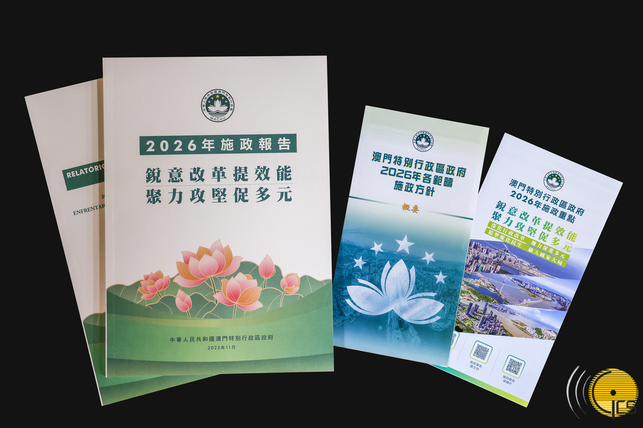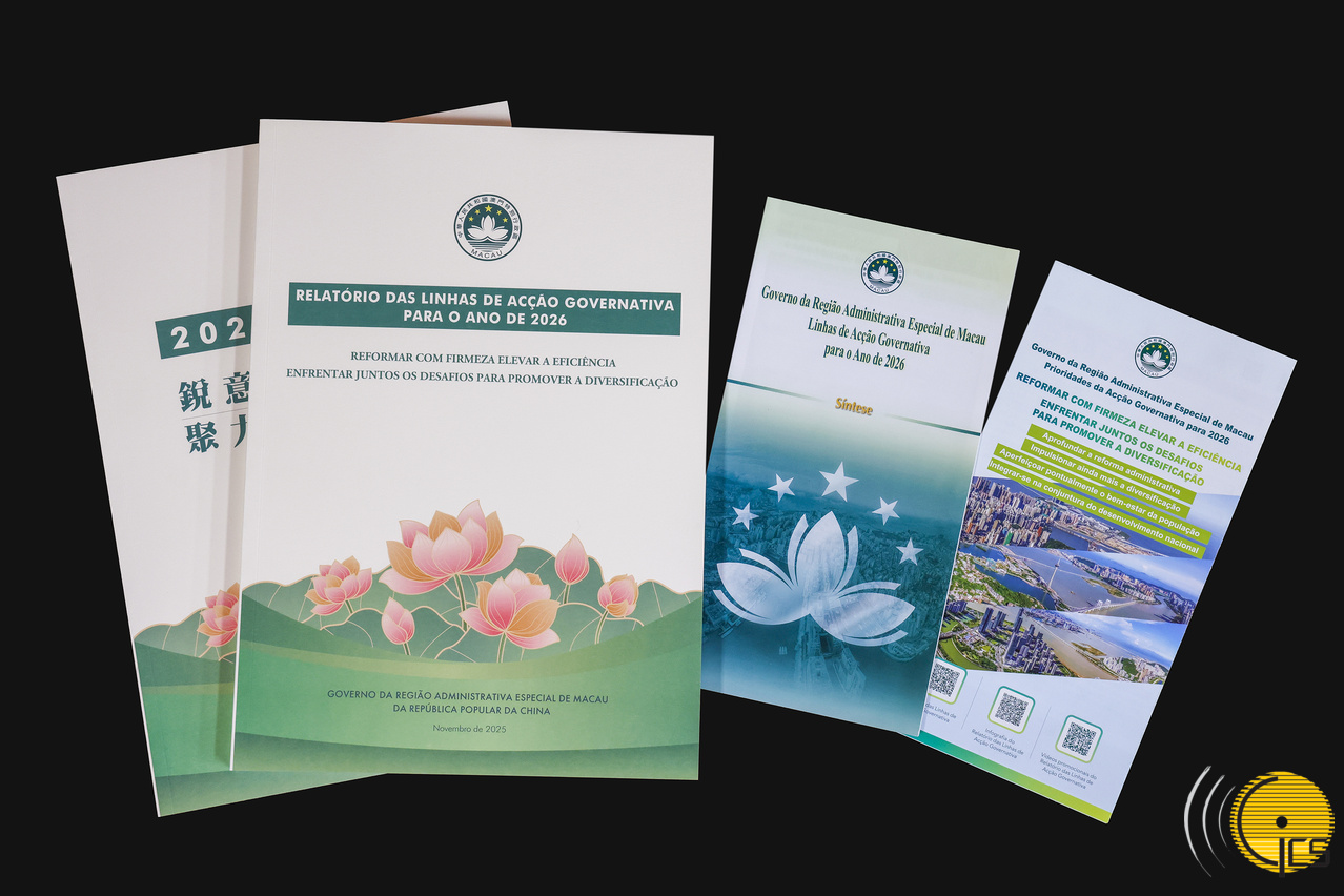 Exemplares e panfletos do Relatório das Linhas de Acção Governativa do Governo da Região Administrativa Especial de Macau para o ano de 2026 disponíveis ao público em vários locais.