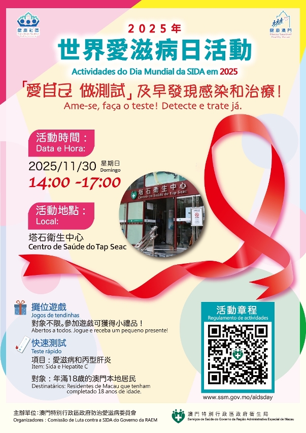 O dia 1 de Dezembro assinala o " Dia Mundial de Luta Contra a SIDA ", cujo tema deste ano é "Sociedade Unida, Inovação e Integridade para Acabar com a SIDA" (em inglês, Overcoming disruption, transforming the AIDS response). A fim de reforçar a atenção dos residentes para a prevenção da SIDA e aumentar a consciencialização sobre comportamentos sexuais seguros, os SS irão organizar, no dia 30 de Novembro, entre as 14h00 e as 17h00, no rés-do-chão do Centro de Saúde do Tap Seac, actividades temáticas que incluem testes rápidos gratuitos e anónimos de anticorpos do vírus da imunodeficiência humana (VIH) e do vírus da hepatite C. O teste requer apenas uma pequena quantidade de sangue, obtida através da picada na ponta do dedo. Após a sua conclusão, será oferecido um brinde. As actividades destinam-se a residentes de Macau com idade igual ou superior a 18 anos que desconheçam o seu estado de infecção, podendo participar mediante a recolha de senha no local. Além disso, os trabalhadores dos SS irão realizar jogos interactivos de flash mob em bancas nas proximidades do Centro de Saúde do Tap Seac, com ofertas de brindes aos participantes. Os residentes são bem-vindos a participar. Para informações mais aprofundadas, podem consultar a zona exclusiva do "Dia Mundial de Luta Contra a SIDA" no Portal de Atenção sobre SIDA dos Serviços de Saúde (www.ssm.gov.mo/aidsday).