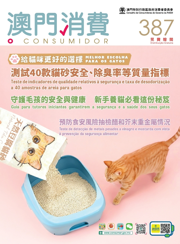 O boletim “O Consumidor” recentemente lançado pelo Conselho de Consumidores (CC) publicou o relatório de detecção de metais pesados a vinagre e mostarda, em que todas as amostras testadas estavam de acordo com as exigências legais de Macau. Esta edição do “O Consumidor” divulgou ainda o relatório do teste comparativo de segurança e qualidade de 40 amostras de areia para gatos, cujos dados podem ajudar o consumidor a tomar opções de consumo mais acertadas.